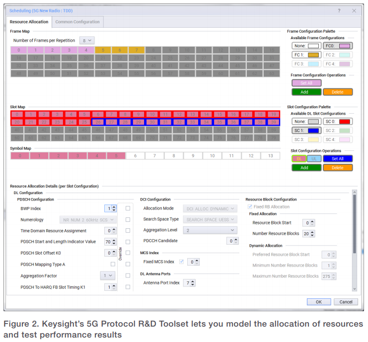 만약 키사이트의 프로토콜 R&D 도구 세트와 같은 툴을 사용하면 리소스 할당을 모델링하고 스크립트를 실행하여 다양한 조건에서 디바이스 성능을 테스트하고 최적화할 수 있다. 설계자는 프레임 당 슬롯 수, 프레임 내의 다운링크와 업링크에 할당된 기호의 순서와 수와 같은 매개변수를 모델링할 수 있다.