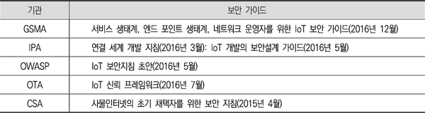 IoT 제품 및 서비스의 보안문제로 여러 유형의 IoT 보안 가이드들도 제시되고 있다. 기존의 단편적인 이슈 및 대책을 제시하던 것에 비해 일본 정보처리기구 IPA(Information-technology Promotion Agency), 국제 이동통신 사업자 협회인 GSMA(Global System for Mobile communication Association), 국제 웹 보안 표준 단체인 OWASP(The Open Web Application Security Project), 국제 클라우드 보안 협의체인 CSA(Cloud Security Alliance) 등에서 IoT 기기의 보안 설계와 개발 및 안전한 서비스 운영 등을 위한 보안 요구사항과 대책을 포함한 상이한 유형의 보안 가이드를 발표하였다.