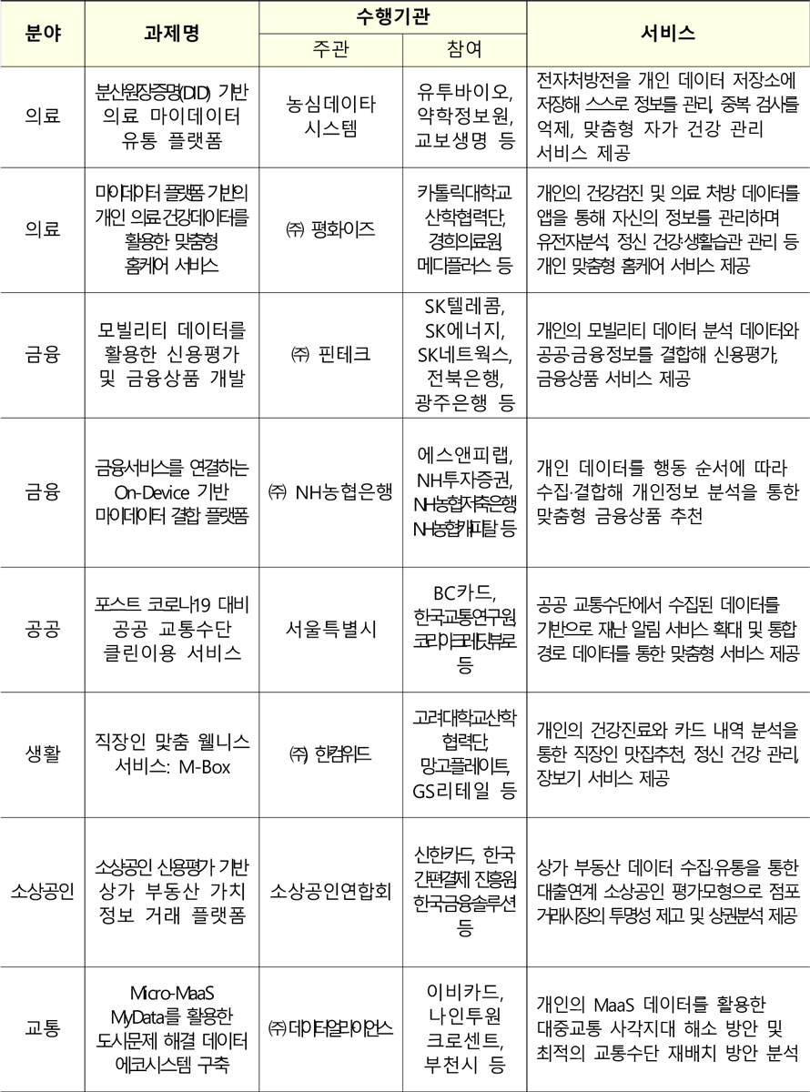 ▲ 2020년 마이데이터 실증서비스 선정 과제 목록
