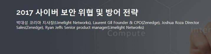 이번 세미나의 주요 내용은 ▲박대성 라임라이트 네트웍스 코리아 지사장의 ‘2017년 국내 사이버 위협 동향(Cyber threat trend in Korea 2017)’ 소개를 시작으로, ▲클라우드 기반 보안 솔루션 기업인 제네지(Zenedge, www.zenedge.com )의 설립자이자 CPO인 라우렌 길(Laurent Gil)과 세일즈 총괄 매니저인 조쉬아 로자(Joshua Roza)가 소개하는 ‘복잡한 웹 비즈니스 환경 속의 보안 위협(Security Threats Facing Complex Web Businesses)’, ▲라임라이트 네트웍스의 선임 프로덕트 매니저인 라이언 제프(Ryan Jeffs)가 발표하는 ‘디지털 어플리케이션 및 자산 보안을 위한 클라우드 기반 다계층 방어(A Layered Defense for Safeguarding Digital Applications and Assets)’ 등의 순서로 진행된다.