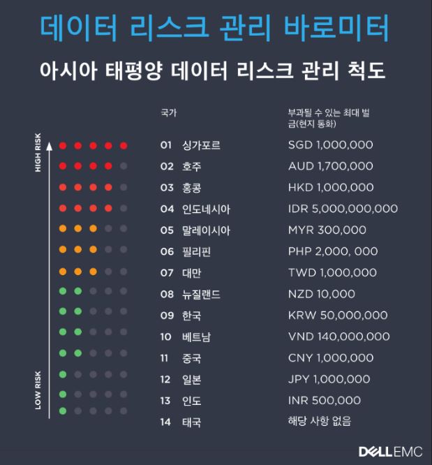IDC는 델 EMC 의뢰에 따라 연구보고서 ‘데이터 리스크 관리 바로미터’를 발표했다. 이 보고서는 한국을 포함한, 호주, 중국, 일본, 싱가포르, 인도 등 아시아태평양 지역의 14개 국가를 대상으로 개인정보보호 규제와 데이터 주권 및 비즈니스 연속성 관련 법규를 조사한 내용을 담고 있다.