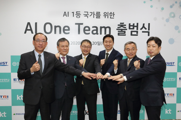 KT, 현대중공업지주, 한국과학기술원(KAIST), 한양대학교, 한국전자통신연구원(ETRI)은 20일, 대전 KAIST 본관 1층 회의실에서 MOU를 체결하고 ‘AI One Team(원 팀)’을 결성했다고 밝혔다.