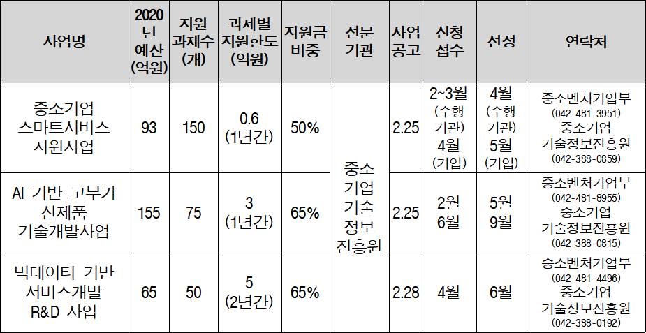중소벤처기업부는 중소기업이 AI와 빅데이터 등 신기술을 활용해 기업의 생산성과 경쟁력을 높이기 위해 중소기업 스마트서비스 지원 사업, AI 기반 고부가 신제품 기술개발 사업, 빅데이터 기반 서비스개발 R&D 사업 등을 추진한다고 밝혔다. 중기부는 개방형 혁신으로 중소기업이 과제를 수행할 수 있도록 컨소시엄 구성 및 협력형 과제를 지원해 사업별 대표 사례를 발굴할 계획이다.
