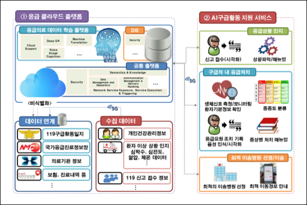 AI 응급의료시스템은 음성, 영상, 생체신호 등 응급환자의 다양한 정보를 실시간으로 수집하고, 5G 망을 통해 통합플랫폼에 전송할 수 있는 구급차 내 장비와 응급데이터 통합·분석 플랫폼으로 구성되며, 의료기관 내 응급실 단말기를 추가 지원한다.