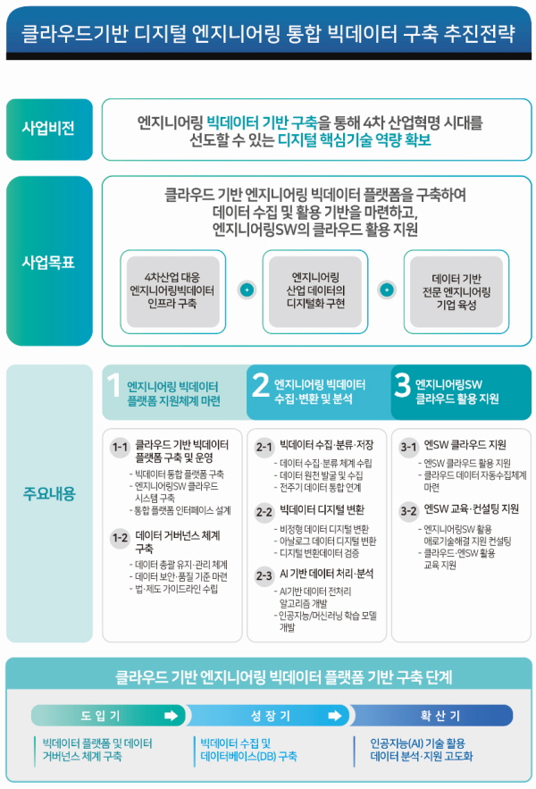 엔지니어링 빅데이터 구축사업의 주요 수행과제를 살펴보면 △엔지니어링 산업의 데이터 특성에 맞는 통합 플랫폼 구축 및 데이터 활용 기반 마련 △기업·공공에 산재되어 있는 엔지니어링 전주기 데이터를 수집하고 AI 기반의 변환·분석 서비스 지원 △클라우드 기반의 엔지니어링SW 운용 인프라 구축으로 SW의 보급·활용 지원 및 동 SW를 활용하는 과정에서 도출되는 엔지니어링 데이터 수집 등이다.
