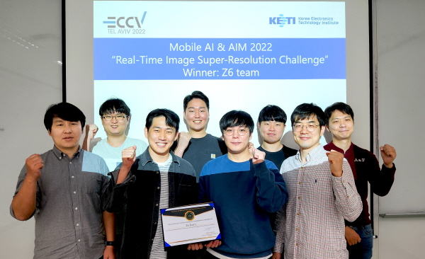 ▲KETI 연구진들이 Mobile AI & AIM 2022 챌린지에서 우승하고, 단체 기념사진을 찍고 있다.