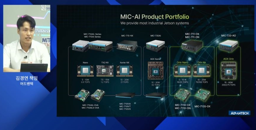 어드밴텍 Industrial IoT 본부 김경연 책임은 AI 개발부터 배포까지 프로세스 가속화를 지원하는 제품, MIC 시리즈 소개 및 적용 사례에 대한 설명했다.