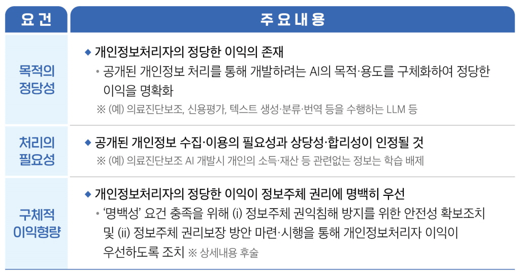 또한 이러한 ‘정당한 이익’ 조항이 적용되기 위해서는, 인공지능(AI) 개발 목적의 정당성, 공개된 개인정보 처리의 필요성, 구체적 이익형량이라는 세 가지 요건을 충족하여야 한다.