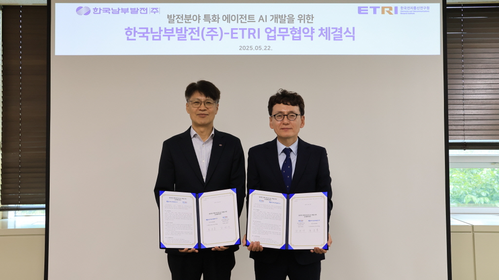 한국전자통신연구원(ETRI)과 한국남부발전㈜은 10일 발전소 운영을 똑똑하게 만드는 전력설비 예지·제어용 인공지능(AI) 기술 개발을 위한 MOU를 체결했다.