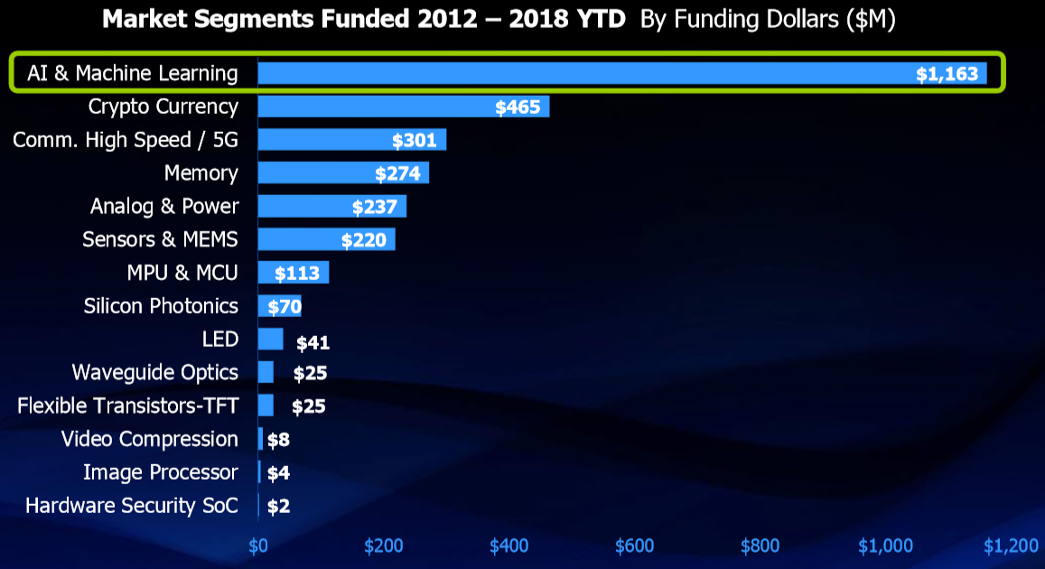 AI 기술이 처음 나왔을 때는 분석할 데이터도 적었고, 컴퓨팅 프로세싱 능력도 낮았으며, 고도화된 알고리즘도 없었고, 돈을 벌 수 있을 킬러 솔루션도 없었다. 현재는 이러한 난관들이 사라지고, 비즈니스에 적용할 수 있는 시장환경이 조성된 것이다. 2018년에 들어서만도 14개의 AI 전문 반도체 설계업체가 투자를 받았다. 해당 기업은 얼굴인식 기술, 자동차, 임베디드 신경망 프로세스, 데이터센터 및 데이터 분석 최적화 기업 등이다. AI 분야에 대한 투자는 중국이 주도하고 있다.