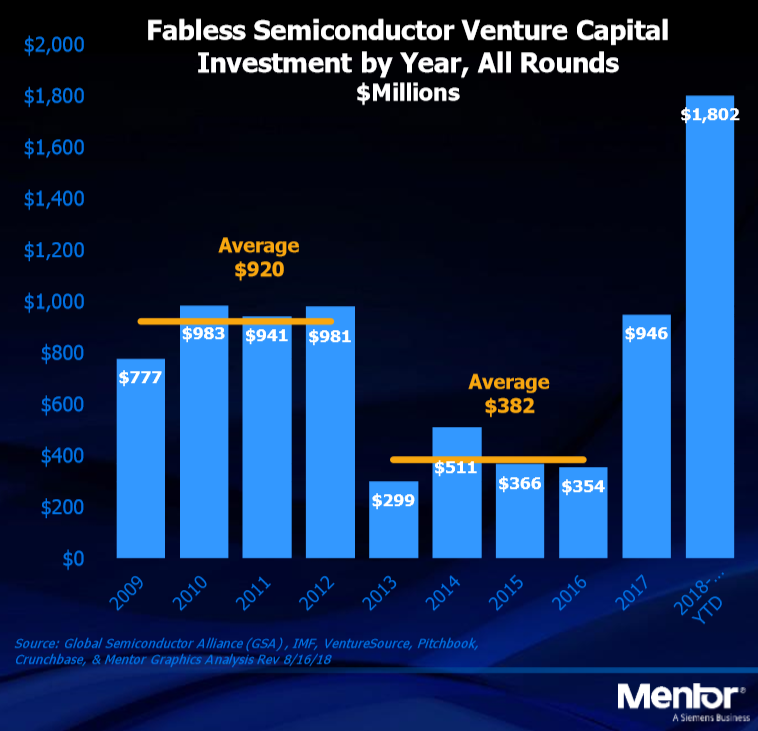 주목할 만한 점은 벤처기업 투자사들의 반도체 업체에 대한 투자가 증가하고 있다는 것이다. 2009년부터 2012년에는 연간 10억 달러, 그 후로 4년 동안 연간 4억 달러, 2017년부터 다시 10억 달러, 올해 상반기에만 18억 달러 투자가 이루어지는 등 그 세가 가파르다.