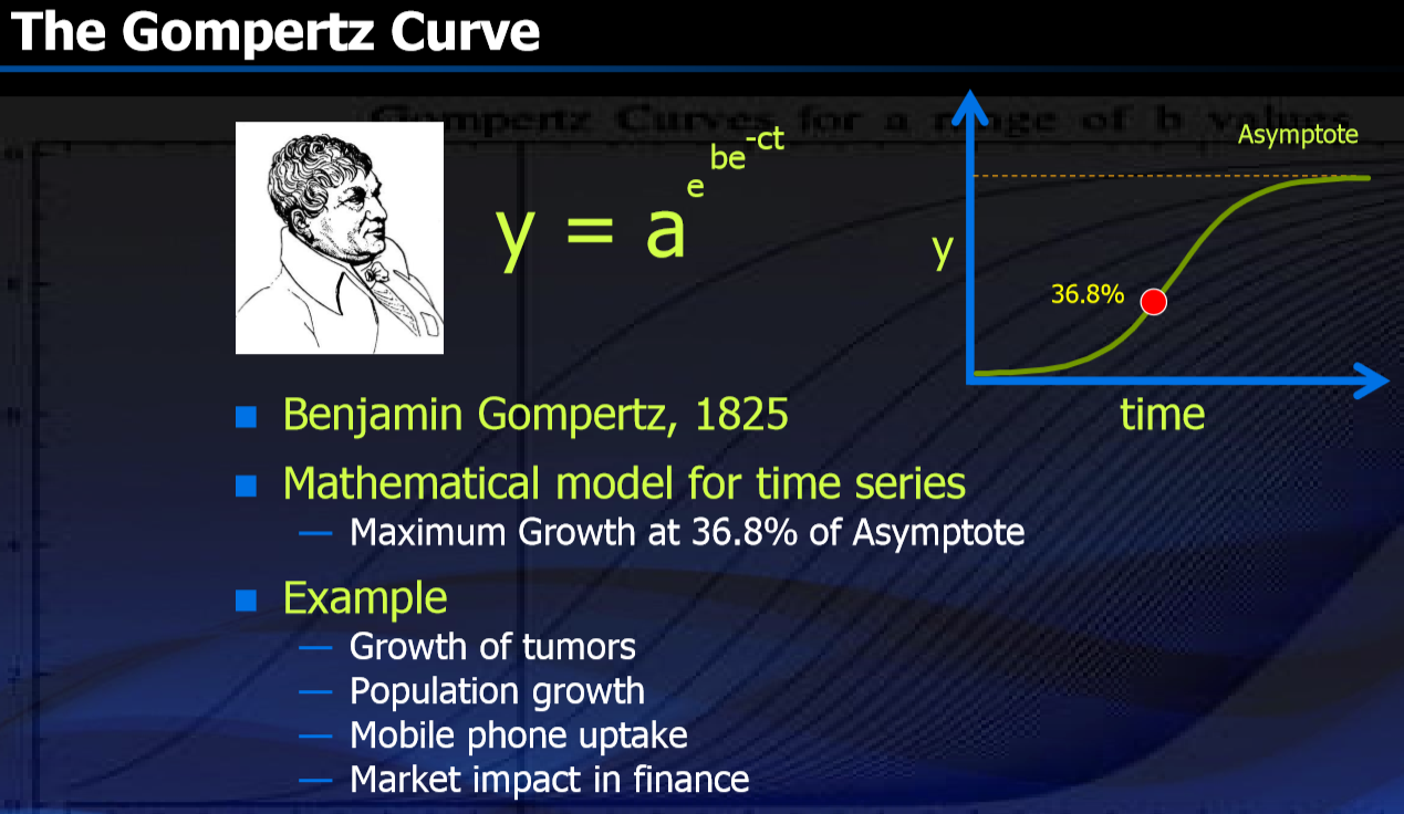 1825년에 영국의 보험 통계사 벤자민 곰퍼츠가 발표한 곰퍼츠 곡선은 초반 완만한 상승과 중반 급격한 성장세, 후반부에 완만한 성숙기를 보여준다. 이 곡선은 암세포 증가, 인구증가, 스마트폰 사용자의 증가, 금융 시장 영향 등에 사용되어왔다. 특히 휴대전화 가입자 수와 PC 노트북 증가 추세에 정확히 들어맞는다.