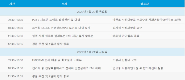 이번 행사는 ‘EMI 이슈와 EMI 차폐를 위한 회로설계 및 솔루션’을 주제로 EMI/EMC 규격 및 인증에서부터 PCB 시스템 노이즈 원인 및 대책, 전기차 입장에서 보는 전자파 간섭문제 해결까지 최신 기술 동향을 다룰 예정이다.