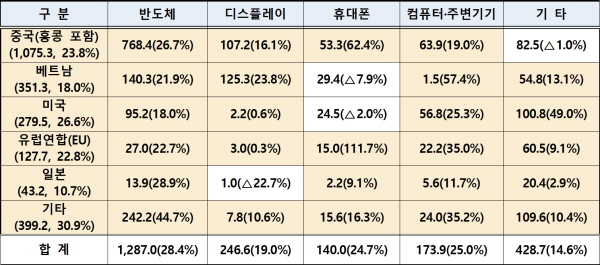 중국은 1,075억3,000만달러로 전년대비 23.8% 증가하며, 역대 두 번째로 높은 실적을 달성했다. 반도체, 디스플레이, 휴대폰 등 주요 품목이 모두 증가했다.