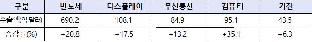 또한 6월 수출입 동향에 따르면 반도체는 123억5,000만달러로 전년동기대비 10.7% 증가했고, 컴퓨터는 15억6,200만달러로 전년동기대비 9.6% 증가했다. 무선통신기기는 11억6000달러로 전년동기대비 10.6% 증가했고, 가전은 6억3,800만달러로 전년동기대비 15.5% 증가했다. 디스플레이는 15억7,000만달러로 전년동기대비 5.9% 증가했다.