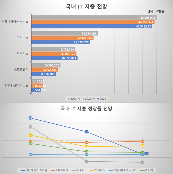 IT서비스 부문에 대한 지출 증가는 지난해 12.8% 성장률에 비해 다소 둔화된 6.2%의 2022년 성장 전망을 보이고 있으나 2023년엔 이보다 증가한 8.3%의 성장률로 약 1조3800억원에 달할 것으로 전망된다.