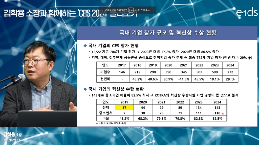 김학용 소장은 지난 25일 e4ds news에서 진행한 “김학용 소장과 함께하는 CES 2024 둘러보기’ 웨비나에서 772개에 달하는 정부기관, 지역, 대학, 기업이 비즈니스 성과를 얻기 위해 CES 2024에 참가했으나 성과를 내기 어려운 전략이었다는 아쉬움을 토로했다