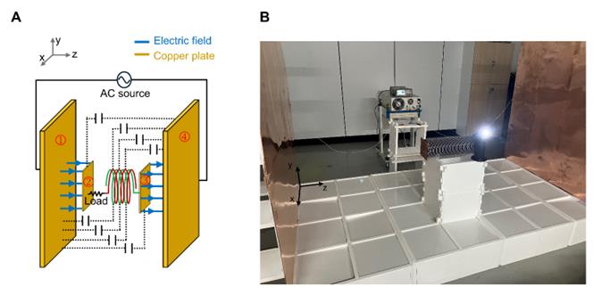 A) 전력 수신기에 Open Bifilar Coil을 구현해 중거리 전력 전송 거리를 달성한 ERWPT 시스템의 구조 B) 중거리 ERWPT 실험 측정 환경 (2m 전력전송 거리)