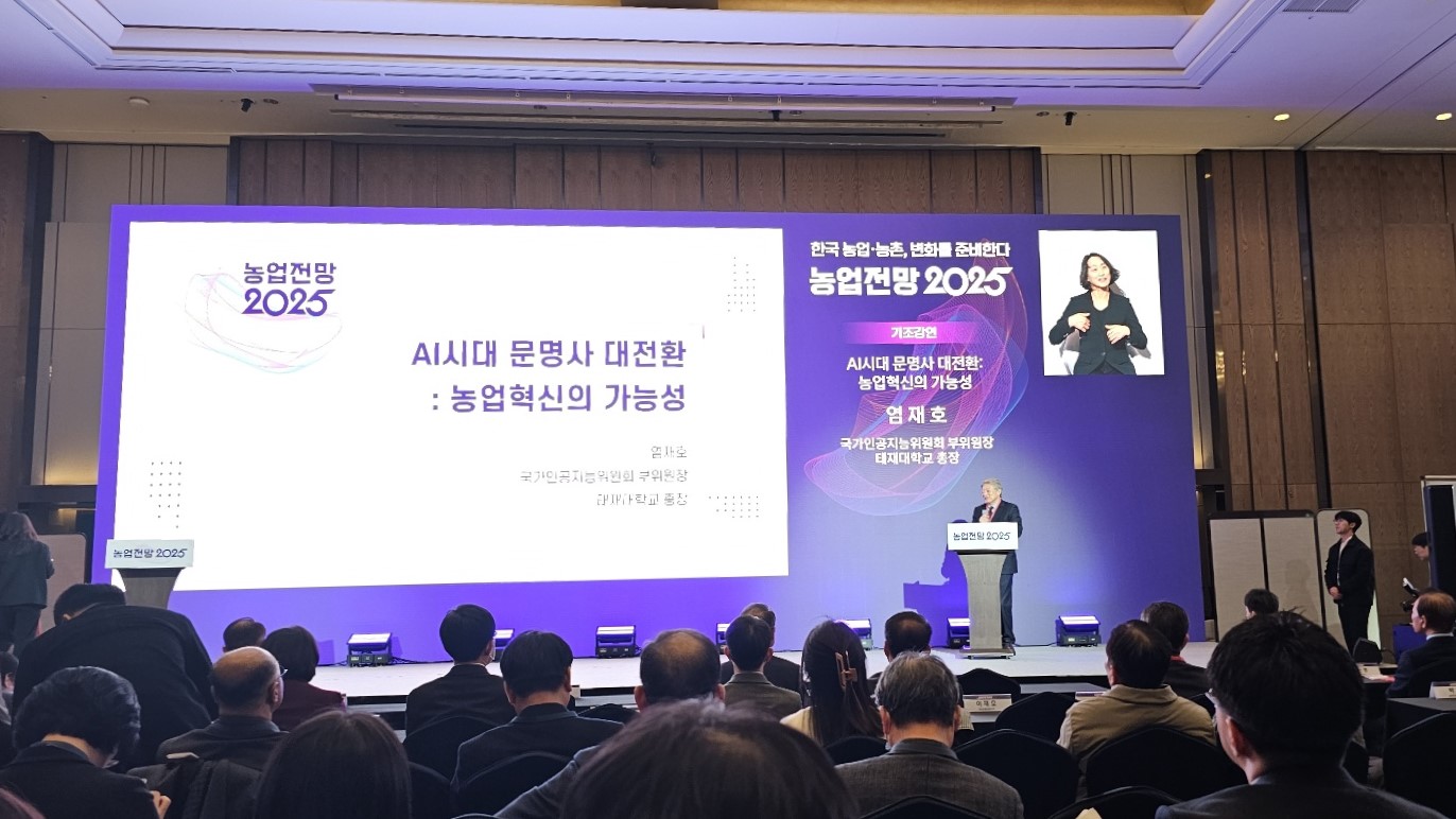 기조연설에는 염재호 국가인공지능위원회 부위원장이 ‘AI 시대 문명사 대전환 : 농업 혁신의 가능성’을 주제조 발표했다. 인류 문명사 전체를 변화시키는 AI가 농업에 미치는 영향에 대해 소개했다.