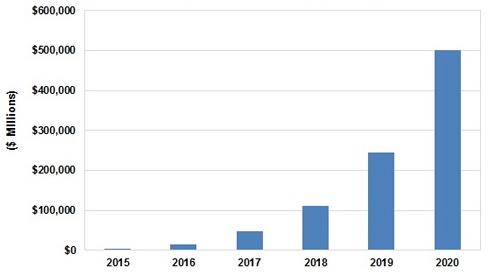 ▲웨어러블 결제 거래량, 세계 시장(2015-2020) 출처: Tractica