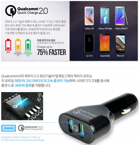 미국 Qualcomm사의 Quick Charge2.0 기술은 기존의 충전방식보다 75% 향상된 초고속 충전기술이며 이 기술을 탑재시켜 일반 저가 차량용 충전기와는 차별화를 두어 프리미엄을 지향한다.