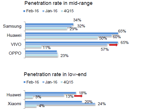 지문센서 도입은 주요 중가 시장에서 2016년 말까지 51%에 도달할 것으로 보인다. 중국 업체들이 지문센서 도입에 적극적이다. 갈수록 심해지는 업체간의 경쟁 때문이다. 중가 및 저가시장이 지문센서 도입을 주도할 전망이다. 지난해 4분기에서 올 1분기, 2분기의 지문센서 도입률을 봤을 때, 중가 시장에서 삼성전자는 29%에서 32%, 34%로 늘었으며 화웨이도 50%, 60%, 65%로 증가했다. 특히 VIVO는 11%에서 57%, 65%로 급증했다. 저가 시장에서는 화웨이가 3%에서 13%, 18%로 급증했고 샤오미는 4%에서 24%로 많이 늘렸다가 20%로 다소 주춤한 상태이다.