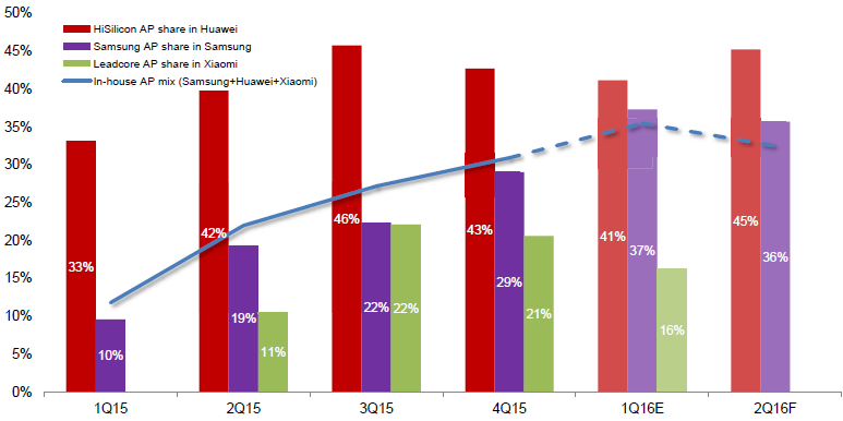 이를 반영하듯 2016년 1분기, 삼성의 자체 AP 사용은 최대 37%에 이를 것으로 전망된다. 화웨이도 1분기에 조금 떨어지기는 했으나 2분기에는 45%까지 자체 AP를 채용할 것으로 보인다. 다만 샤오미는 자체 리드코어(Leadcore) AP를 2015년 3분기에 22%까지 확대했다가 올 1분기에는 16%로 떨어졌다. 샤오미의 AP 점유율이 떨어진 이유는 중국 온라인 스마트폰 업체들이 늘면서 타격을 받은 이유가 큰 것으로 분석된다(실제로 중국 핸드셋 시장에서 Oppo나 Vivo와 같은 업체들이 급성장하면서 샤오미의 온라인 시장이 잠식당하고 있다).