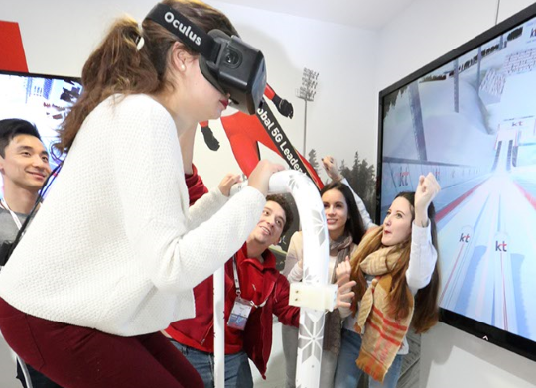 ▲디지털 콘텐츠 산업은 2014년 963억 달러에서 2020년 약 1540억 달러의 시장을 형성할 것으로 전망된다. 사진은 스키장 체험을 내세운 KT의 VR 시연 모습.