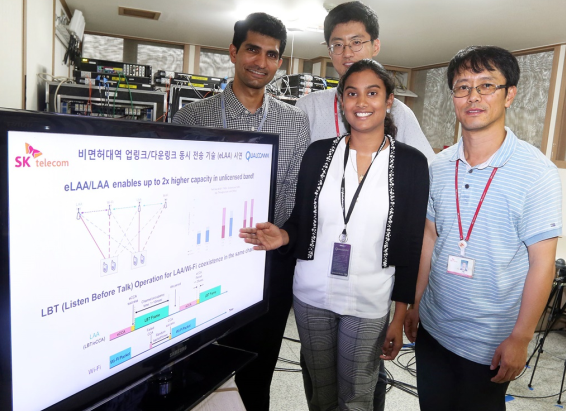 SK텔레콤은 세계 최대 통신용 반도체 제조업체인 퀄컴(CEO, 스티브 몰렌코프, www.qualcomm.com)과 함께 ‘비면허대역 주파수 집성기술’(eLAA:Enhanced Licensed Assisted Access)을 개발 완료하고 분당 종합기술원에서 시연했다고 밝혔다.