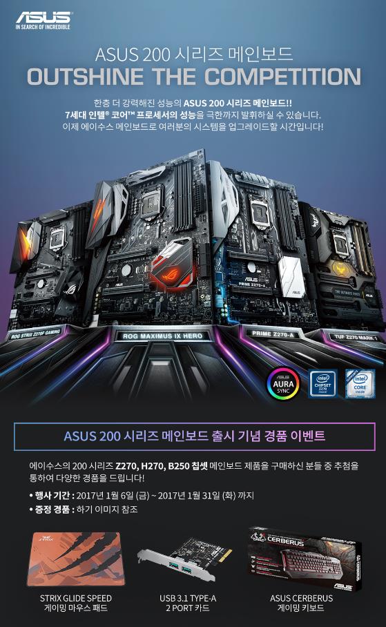 그 외에 5개 쇼핑몰에서 진행되는 이벤트는 에이수스가 출시한 모든 200 시리즈 메인보드 구매자 가운데 최대 200명을 추첨해 경품을 지급한다. 이벤트 참여 기간은 이달 31일까지이며, 에이수스 STRIX GLIDE Speed 게이밍 마우스 패드, 외장 USB 3.1 Type-A 2포트 카드, 에이수스 Cerberus 게이밍 키보드 등의 경품을 준다.