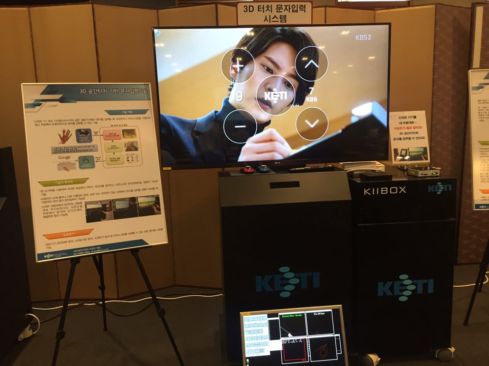 리모컨 없이 TV를 손짓해 글자를 입력하고, 채널을 변경할 수 있는 비접촉식 NUI/NUX을 소개했다. 안양근 책임 연구원의 말에 따르면, 비슷한 기술을 개발한 외국의 Point grab과 Eye Sight는 사용자의 눈과 손끝이 장치와 일치되면 ‘리모컨’이 되는 형태로, 홈 IoT와 연계해 도입단계에 이르렀다.