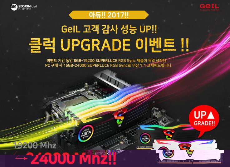 서린씨앤아이는 전세계 PC 매니아 들에게 각광을 받고 있는 게이밍 및 화려한 LED 튜닝 효과를 가진 게일(GEIL)사의 소프트웨어 조명 제어 메모리 DDR4 슈퍼루스 RGB Sync(SUPERLUCE RGB Sync) 장착PC 구매자를 대상으로 24000(3000MHZ)클럭 업그레이드 이벤트를 진행한다.