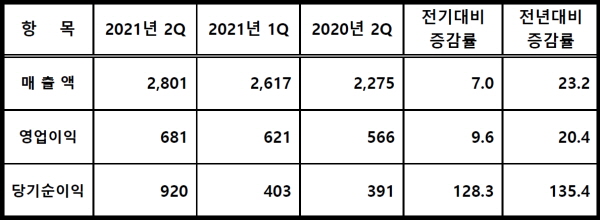 ▲SK머티리얼즈의 2021년 2분기 경영실적(연결재무제표 기준, 단위 : 억원,%)