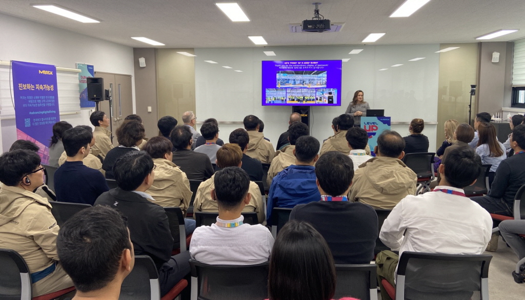 ▲캐서린 데이 카스 머크 수석부사장이 직원들을 대상으로 강연을 하고 있다.