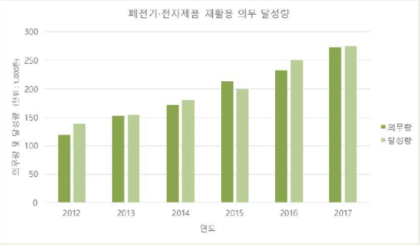 ▲폐전기·전자제품 재활용 의무량 및 달성량(2012∼2017)(출처 : 한국환경산업기술원)