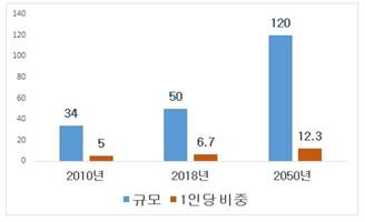 ▲글로벌 전자전기 폐기물 현황 및 전망(단위 : 백만 톤, kg, 자료 : Handelsblatt, Statista)