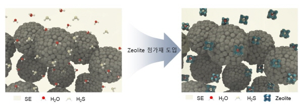 KETI 차세대전지연구센터(센터장 유지상)에서 개발한 소재 기술은 고체전해질에 제올라이트 나노입자를 소량 첨가·합성함으로써 황화수소 발생을 감소시키는 것이 핵심으로, 대기 내 수분과 황화수소 가스를 동시에 흡착하는 제올라이트의 특성을 활용했다.