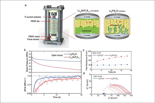 울산과학기술원(UNIST) 에너지화학공학과 이현욱 교수팀은 7일, 美 조지아 공대 매튜 맥도웰(Matthew T. McDowell) 교수 연구팀과 압력 변화를 분석해 황화물 전고체 전지 내 2차상과 수지상 물질 생성 반응을 구분하는 데 성공했다.