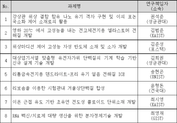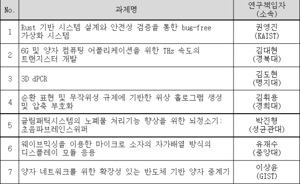 차세대 반도체, 가상화 시스템 운영 체제, 세계 최고속 트랜지스터 등 미래 신기술뿐만 아니라 노화 메커니즘 규명, RNA 백신/치료제 정제 기술 등 전 인류적 문제 해결에 기여하는 과제도 다수 포함됐다.