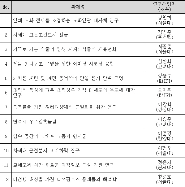 43세 이하 ‘신진 연구책임자’가 12명으로 전체의 44%를 차지했고, 서울대 황준호 교수, 성균관대 김희권 교수, GIST 최영재 교수 등 30대 연구책임자도 6명이나 포함됐다.