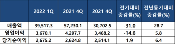 전년 동기 대비 매출은 28.7%, 영업이익은 5.8% 증가했다. 전분기 대비 매출은 31.0%, 영업이익은 14.6% 감소했다.