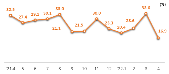 전년 4월比 16.9% 증가, 무역수지 78.1억불 흑자 달성
