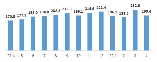 2022년 4월 ICT 수출액이 4월 누적 기준 최고 실적을 달성하며 지난 3월 232.6억불에는 미치지 못했지만 13개월 연속 두 자릿수의 성장세를 이어갔다.