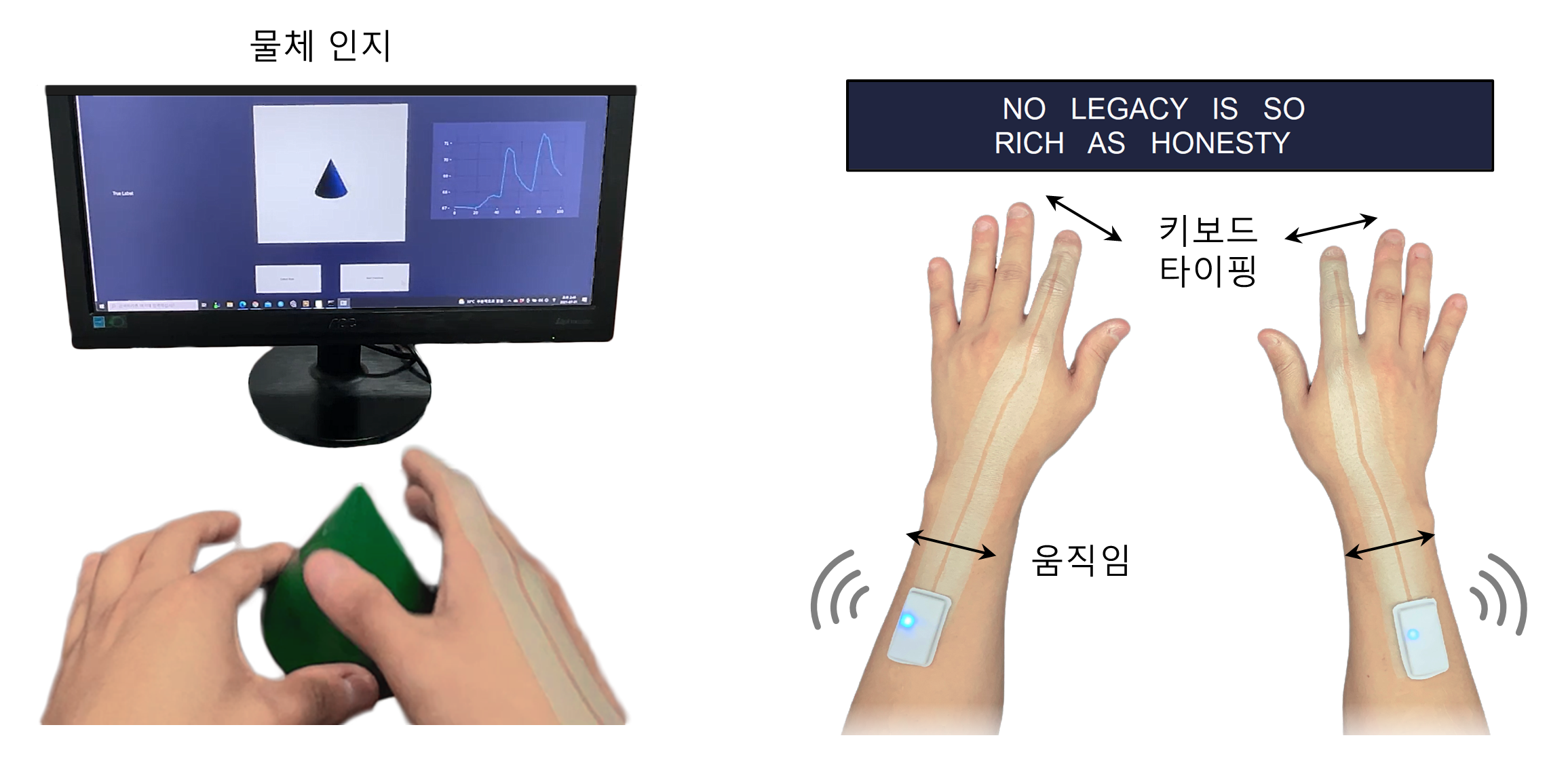 ▲개발된 시스템을 이용한 물체 인식 및 가상 키보드 타이핑. (왼쪽) 전도성 나노망사와 블루투스 모듈을 임의의 사용자가 장착한 뒤, 5번의 반복 학습만을 통해 총 6가지 종류의 물체를 실시간으로 예측하는 모습을 보여준다. (오른쪽) 키보드를 통해 몇 번의 반복 학습을 주어주면 키보드가 없더라도 사용자가 키보드 자판을 입력하는 모습을 볼 수 있다. (그림 - 한국과학기술원)