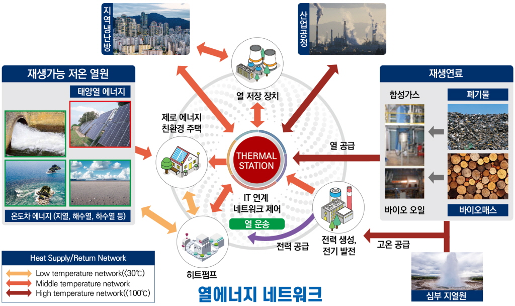 열에너지 네트워크는 열에너지 생산-수요 불균형을 넘어 에너지 이용 효율을 높이는 기술로, 단순한 열에너지원 공유를 넘어 에너지 거래 개념까지 확장 가능하다. 산업폐열을 이용한 열에너지 거래기술 개발 및 열에너지 네트워크 실증을 핵심 전략으로 꼽았다.