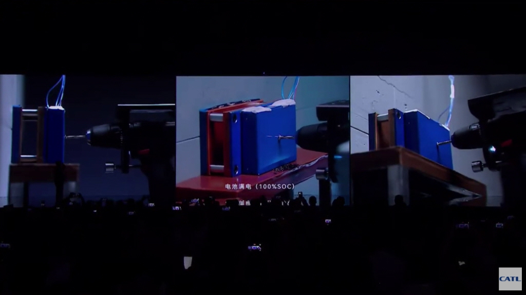 ▲CATL이 나트륨이온 배터리를 드릴로 뚫으며 안전성을 과시했다.(사진 : CATL 유튜브영상)