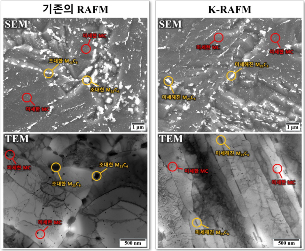 K-RAFM은 타국 RAFM강이 지닌 두 가지 한계를 동시에 돌파했다. 연구진은 타이타늄을 미량 첨가해 크롬계 거대 탄화물 생성을 억제하고, 열처리 온도를 730∼740℃로 낮춰 탄화물 입자를 더욱 미세화했다.