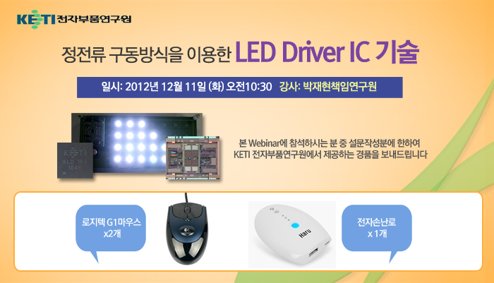 최근 LED는 액정 디스플레이 후면광원, 카메라 폰의 플래쉬, 자동차용 광원, 교통신호등, 치료용 광원 및 일반 조명에 이르기까지 그 응용분야가 폭발적인 증가를 나타내고 있는데, 이는 LED의 높아진 광 효율, 긴 수명, 낮은 유지관리 비용, 친환경 등의 장점에 기인한다. 이러한 LED 응용분야의 증대는 이의 적절한 구동을 위한 LED 드라이버의 수요증가와 함께 한다. LED는 그 밝기가 순방향 전류에 직접 비례하는 전류구동 소자이다. LED를 정전류로 구동해야 하는 이유는 크게 두 가지인데, 소자의 최대정격전류를 넘기지 않음으로써 신뢰성을 확보하는 것과 원하는 광 특성을 정확히 얻기 위한 것이다. 본 세미나를 통해서는 이러한 LED 구동회로 기술에 대한 소개와 전자부품연구원에서 개발하고 있는 정전류 구동방식의 LED Driver IC에 대한 기술과 더불어 현재 일반적으로 사용되는 LED 구동방식 및 이의 문제점과 올바른 LED 구동방식에 대해 알아 본다.