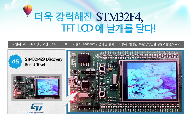 더욱 강력해진 STM32 F4, TFT LCD에 날개를 달다! STMicroelectronics가 자랑하는 최신 하이엔드 MCU 제품군, STM32 F4가 더욱 강력해졌습니다. 성능 자체뿐만 아니라, 메모리 사이즈는 2Mbite로 업그레이드 되었고, SDRAM, TFT LCD, SAI 등의 기능 지원도 가능하며, STM32 제품군의 강력한 성능이 더욱 돋보이게 할 것 입니다. 6월 11일, 더욱 업그레이드된 STM32 F4 를 e4ds에서 만나세요! STM32 F4에 대한 상세한 소개와 함께, 실제 데모도 확인 할 수 있습니다. STMicroelectronics의 전문 엔지니어들이 직접 답변을 제공하는 질의응답 세션에서, 그동안 가지고 있던 STM32 제품에 대한 궁금증도 해결할 수 있을 것입니다. STMicroelectronics가 올해 최초로 국내에서 진행하는 STM32 F4 세미나에, 많은 분들의 참여를 바랍니다.