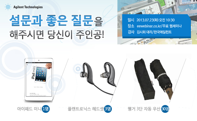 - 기술성 질문들은 세미나 시간에 애질런트 담당자분들이 친절하게 답변해 드립니다. 방송시간 때 궁금하신 점 모두 물어보시고 아이패드를 포함한 푸짐한 경품도 모두 받아가세요. ^^